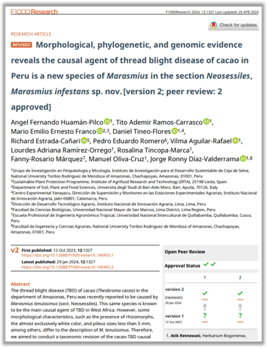 Título: Morphological, phylogenetic, and genomic evidence reveals the causal agent of thread blight disease of cacao in Peru is a new species of Marasmius in the section Neosessiles, Marasmius infestans sp. nov.